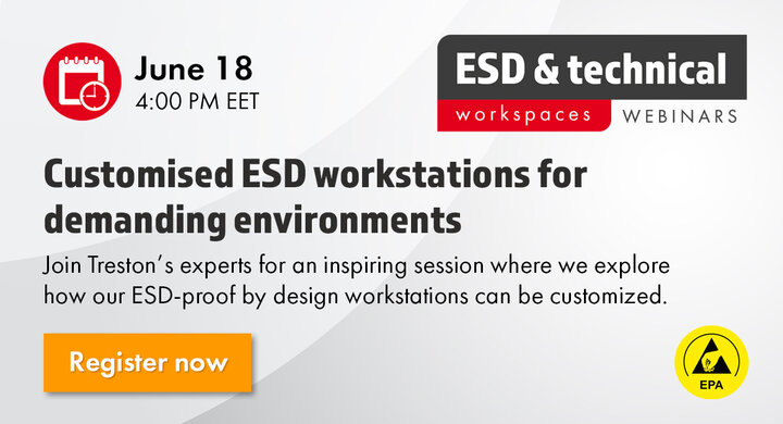 Join us for an insightful session where Treston experts dive into customized ESD and technical furniture solutions designed specifically for demanding EPA environments. Discover how our ESD-proof by design workstations serve as the perfect foundation for tailored setups – and see real-world examples of how we’ve helped customers meet strict ESD requirements with smart, flexible solutions.