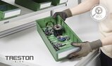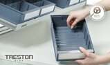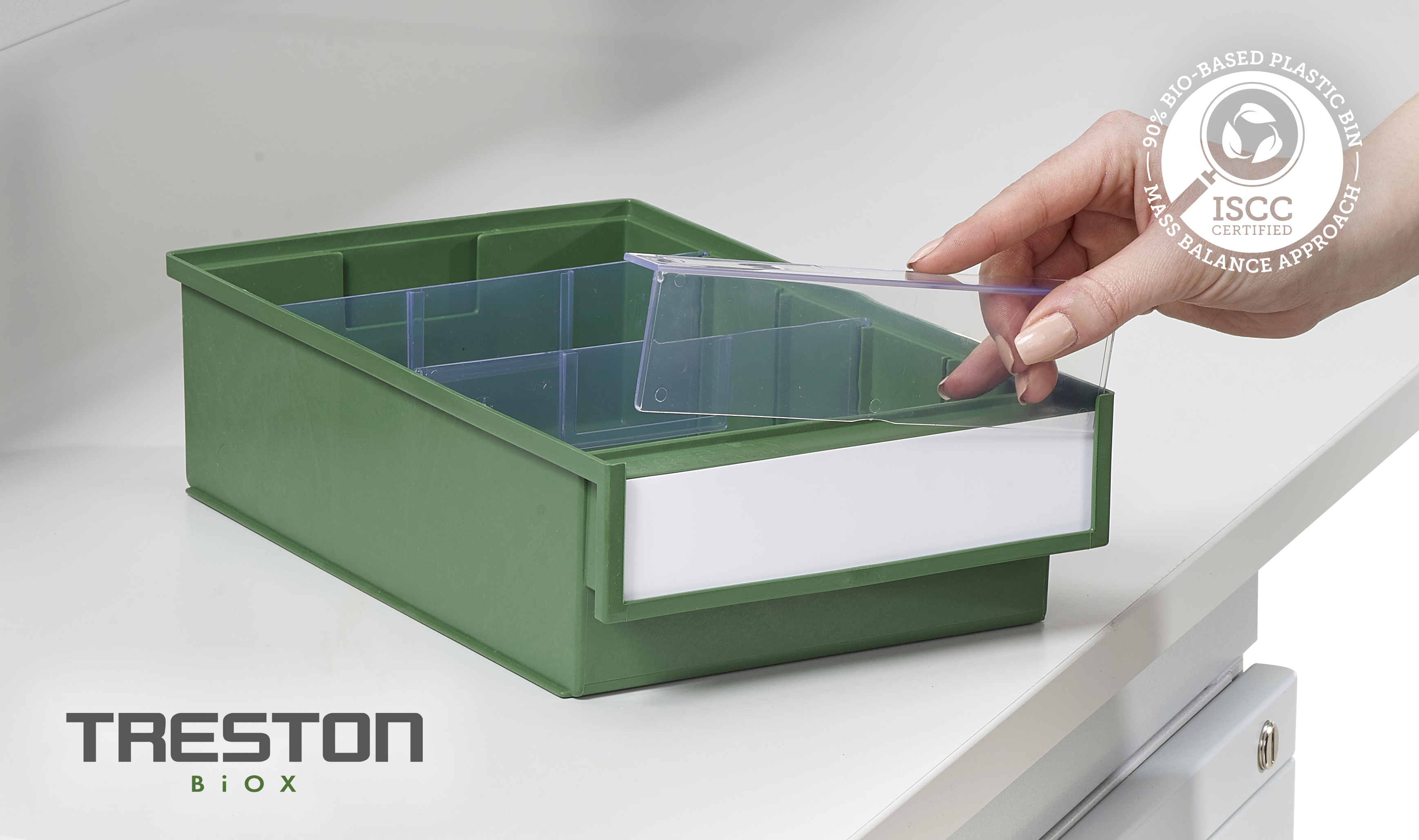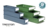The shelf bin family offers 11 sizes to suit a variety of storage needs. Available in bio-based plastic, 100% recycled plastic, or classic plastic, these bins are designed for durability and flexibility. They stack securely on top of each other — even bins of different lengths when the width is the same. Straight sides maximize capacity, while optional side-to-side dividers keep contents organized. Each bin comes standard with a label and protective cover. Designed to fit all metric shelves, cabinets, and industrial workstations, Treston shelf bins ensure efficient and versatile storage.